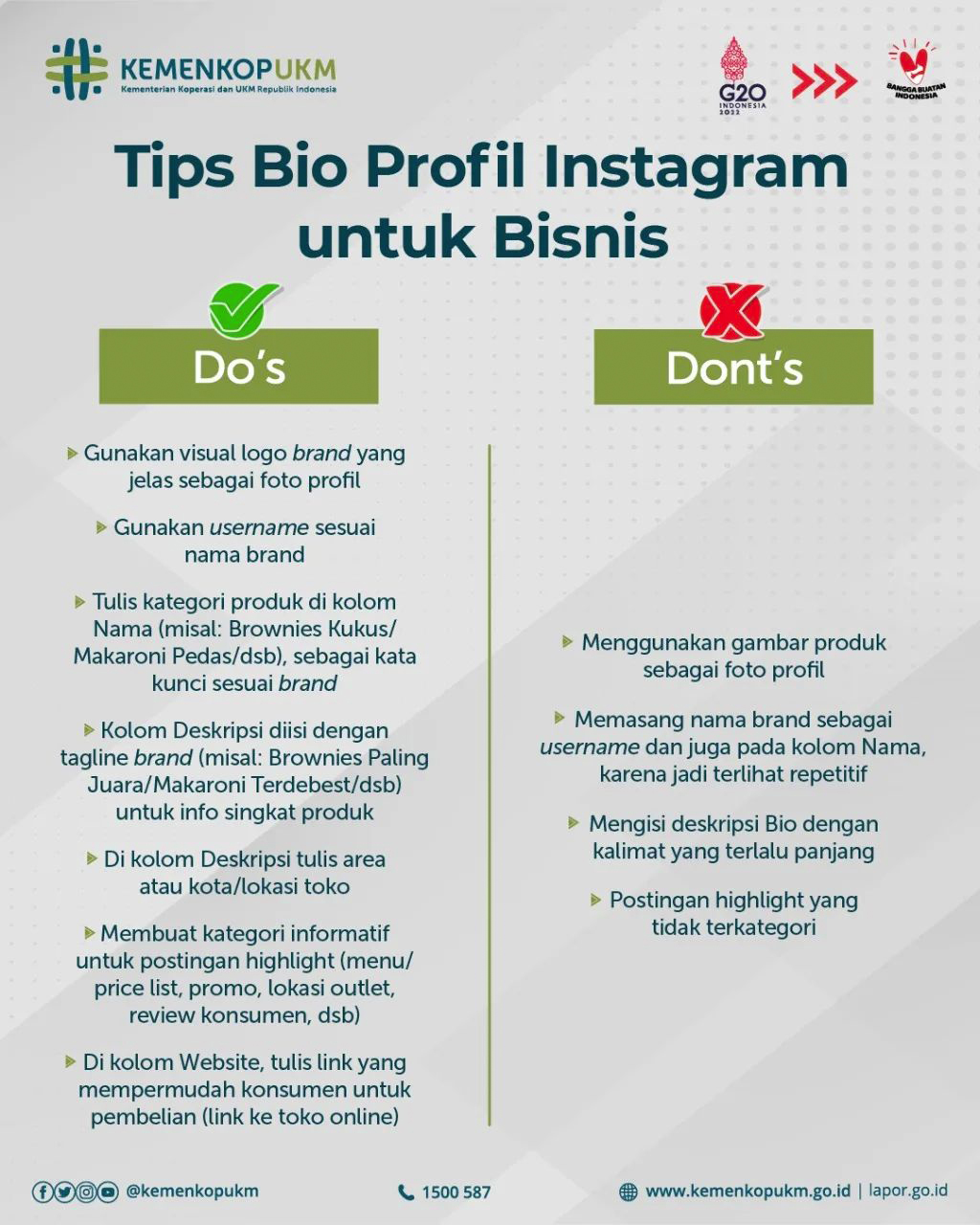 Dalam platform Instagram, bio profil menjadi "etalase" terdepan bagi bisnis Sobat. Jadi, sebisa mungkin harus memberikan informasi tentang brand/produk yang jelas namun singkat.